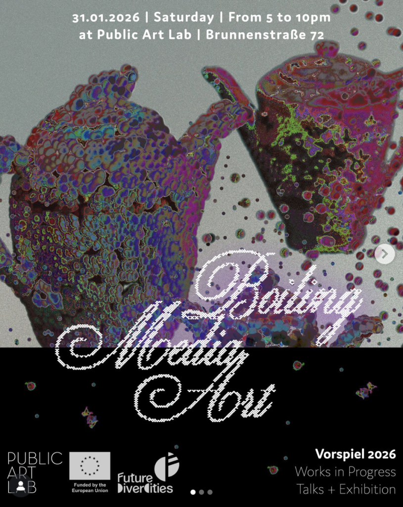 As part of Vorspiel 2026 initiated by transmediale & CTM celebrating Berlin’s independent art spaces, Public Art Lab invites you to Boiling Media Art on 31st January. This was not a showcase of finished works, but a shared moment of becoming: emerging media artists opened their processes, experiments, and questions across sound, audiovisual, performance, visual, and research-based practices. Feedback unfolded as dialogue, moving fluidly between contributors and the audience.