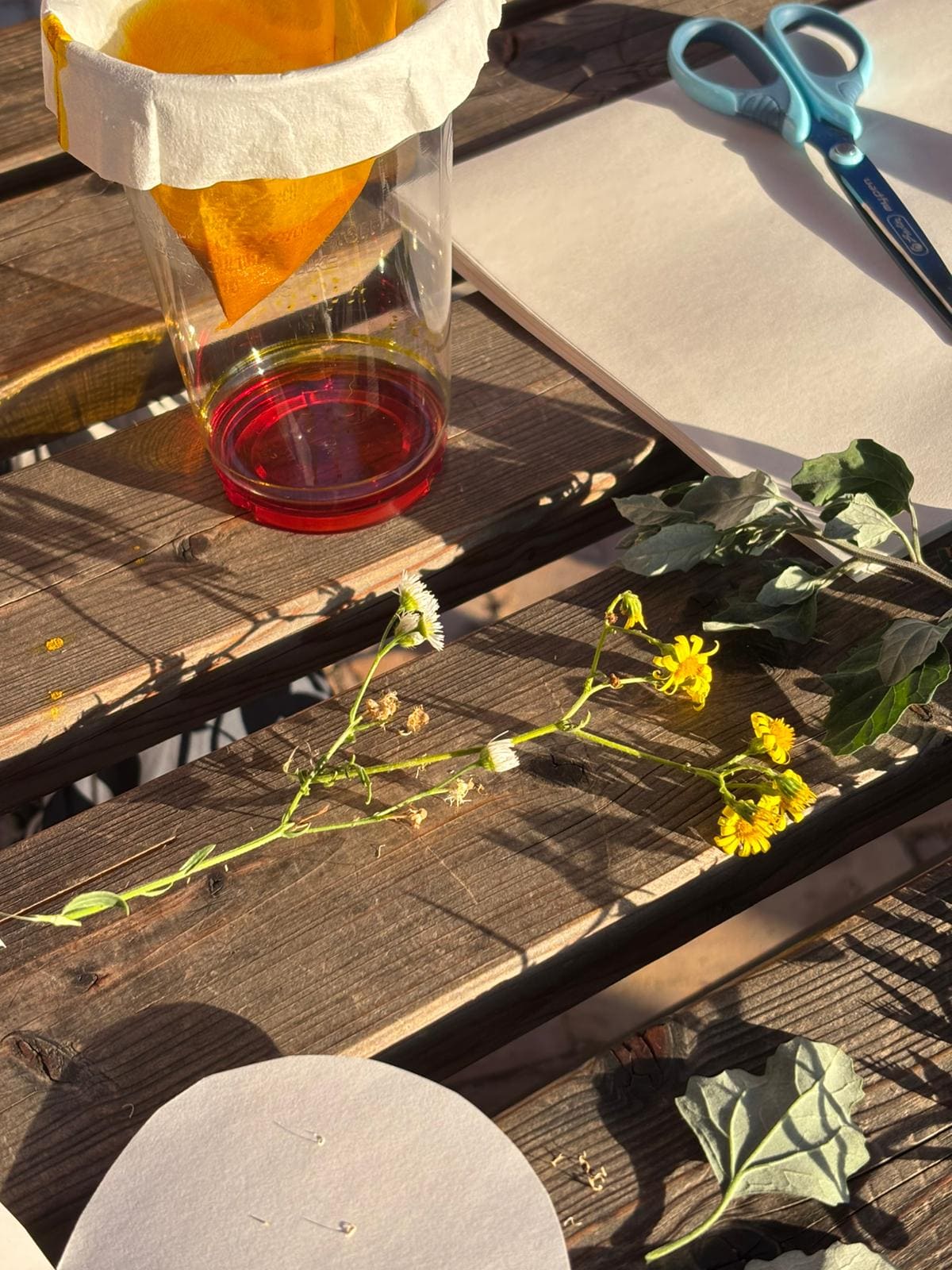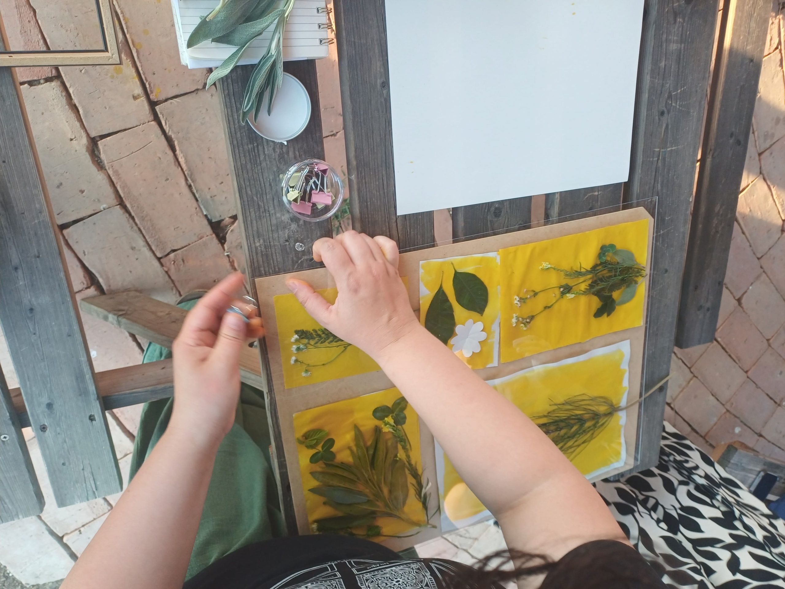 The second day featured both theoretical and hands-on sessions. The practical workshop on anthotypes (UV-sensitive plant-based prints) began with a walk through the community garden. Participants discussed local plant knowledge, biodiversity indicators, and the importance of recognizing pioneer plants. Christina, the landowner, shared valuable insights into the site’s ecological history and water systems, underlining how understanding a place’s past shapes its future potential. The group also discussed the principles of responsible foraging before creating anthotypes using turmeric and alcohol prepared from plants collected in the garden.